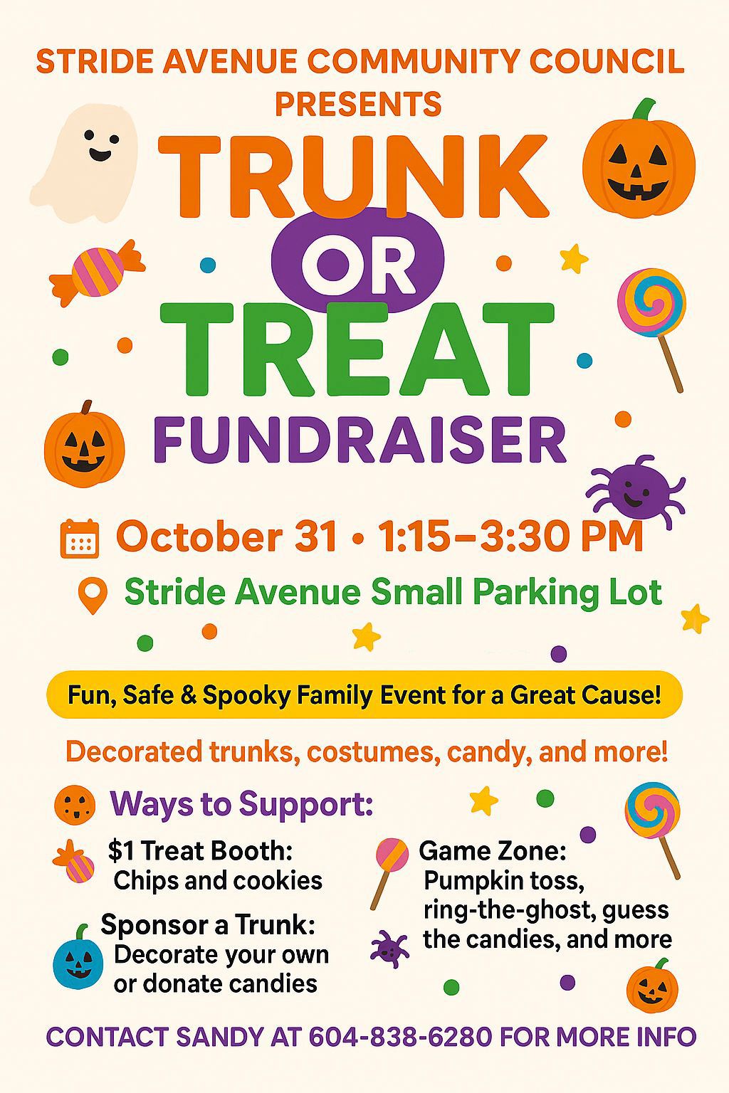 Please join usFriday, October 31between 1:15-3:30 for a Trunk or Treat Event in the small parking lot. This fun event is being organized by the Stride Avenue Community Council. As this event is a fundraiser, there will be a small concession stand open and a game that will cost $1.
